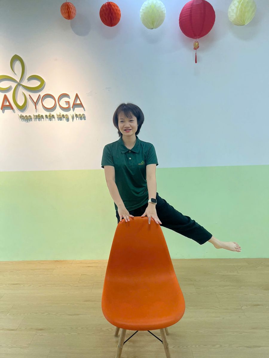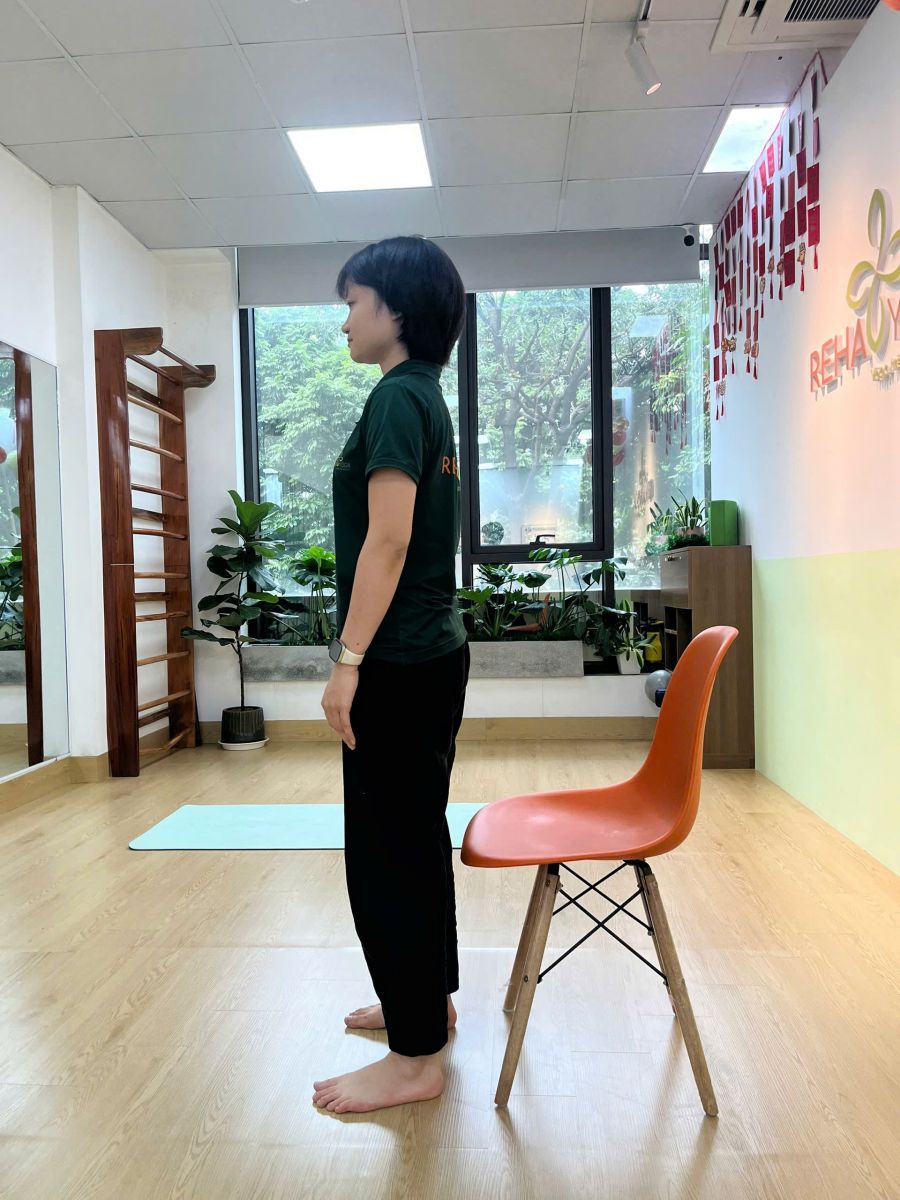 - Đứng thẳng, hai tay vịn ghế hoặc tường
