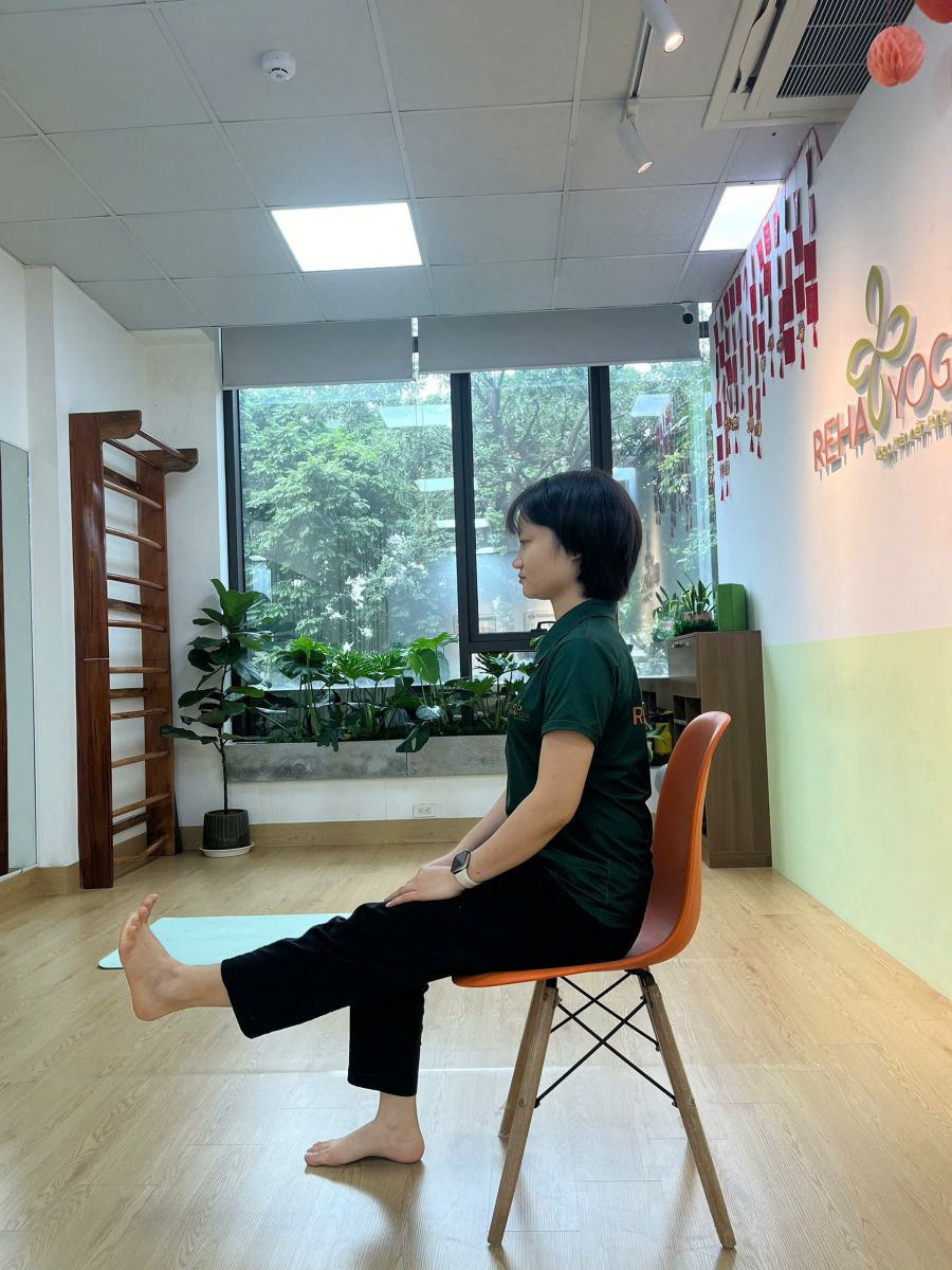 - Ngồi trên ghế, lưng thẳng, hai chân mở rộng bằng vai