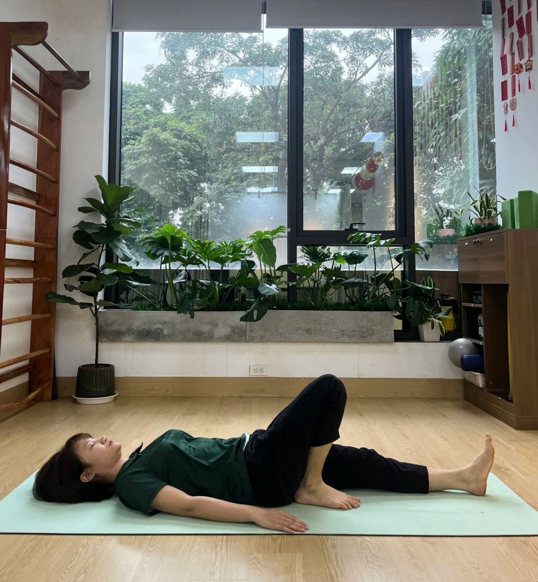 - Nằm ngửa, một chân gập, chân còn lại duỗi thẳng