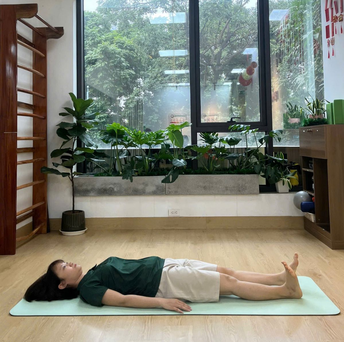 - Nằm ngửa trên mặt phẳng, hai chân duỗi thẳng