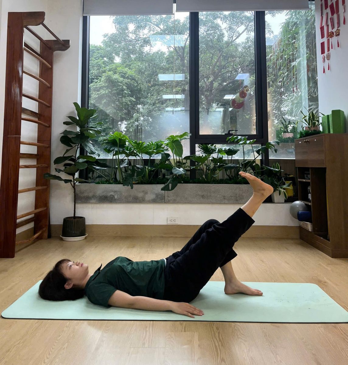 - Nâng chân duỗi lên cao khoảng 30–45 cm