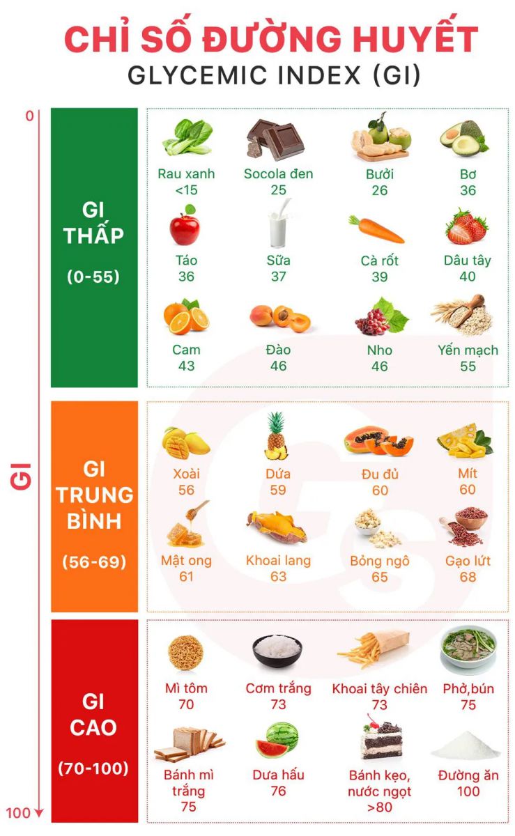 Chỉ số đường huyết (GI – Glycemic Index) phản ánh mức độ làm tăng đường huyết của thực phẩm sau khi ăn.
