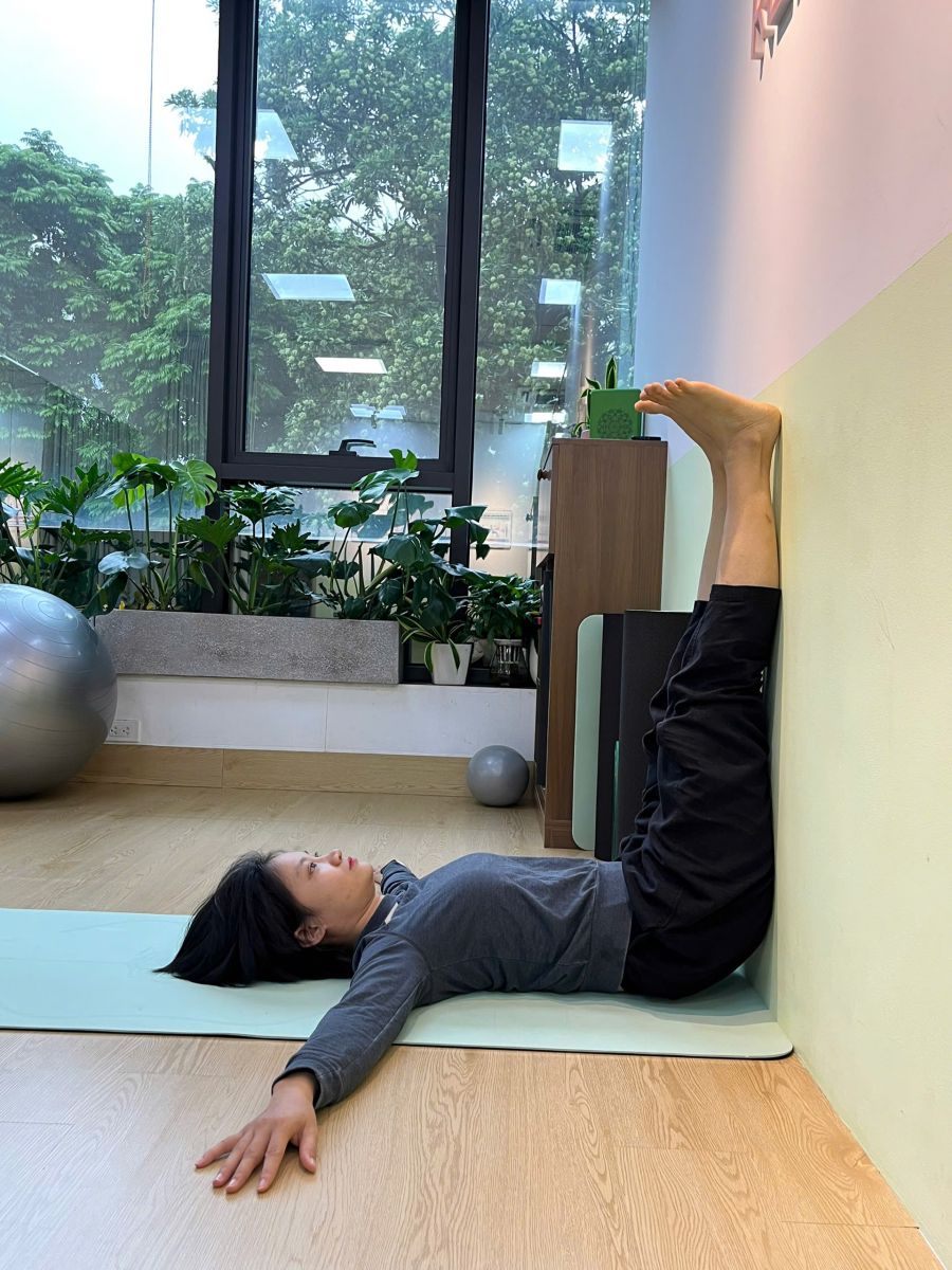 - Nằm ngửa cạnh tường, nâng hai chân lên dựa vào tường, hai tay dang sang hai bên, thả lỏng tay.
