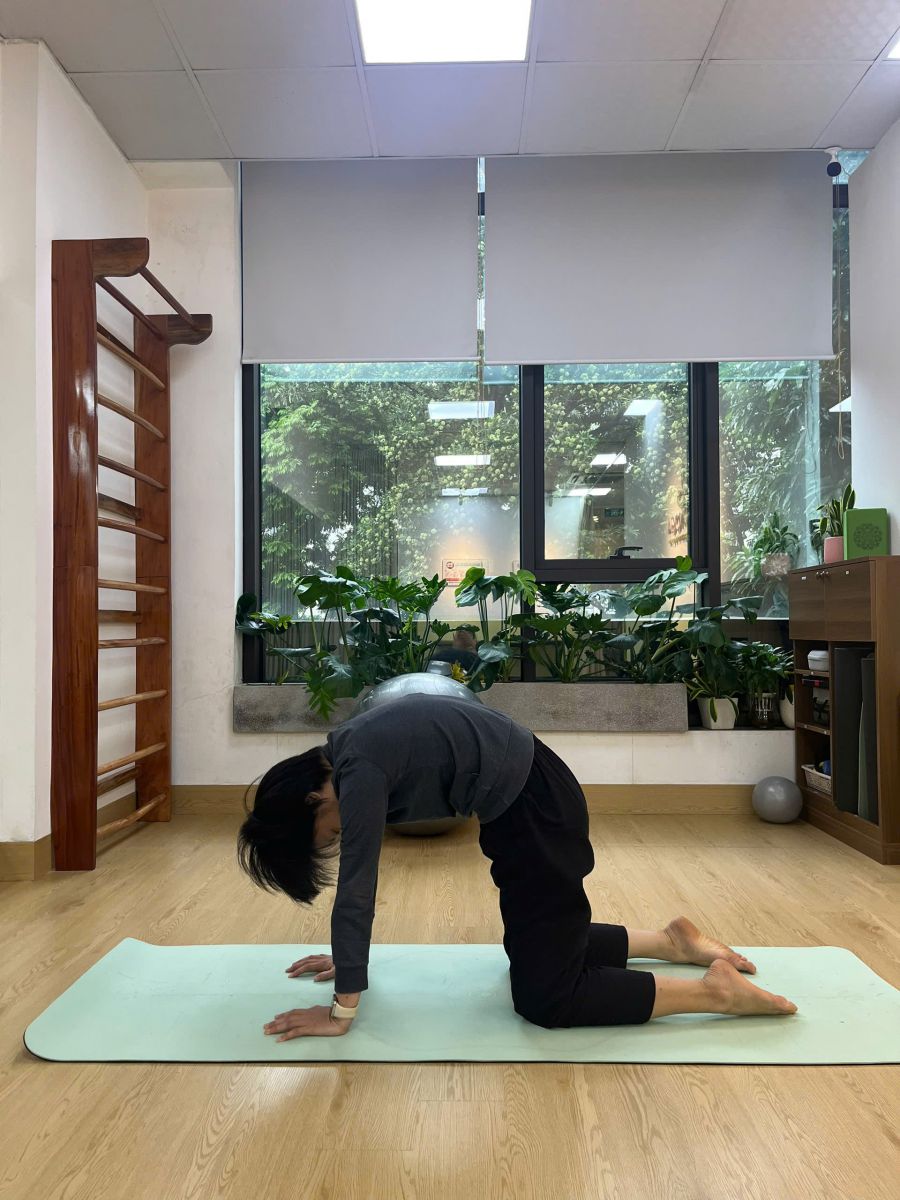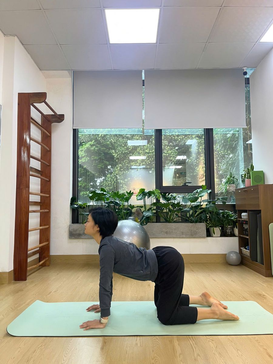 - Khi thở ra: cuộn lưng tròn, hóp bụng, cúi đầu (tư thế con mèo).