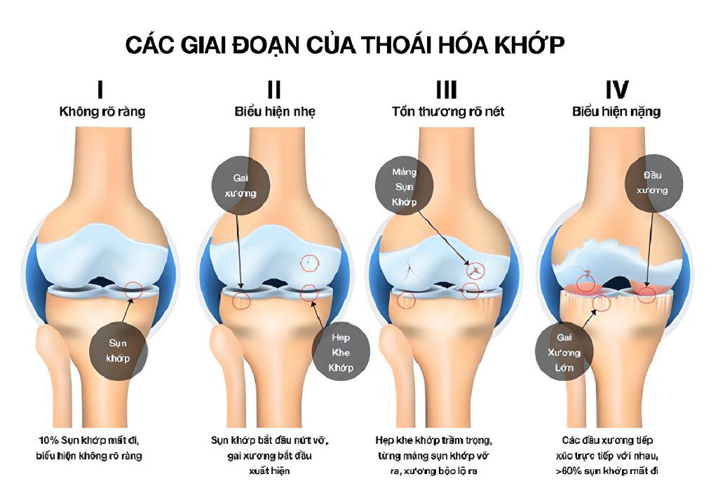 Bệnh thoái hóa khớp tiến triển theo 4 giai đoạn chính từ nhẹ đến nặng. Hiểu biết đúng từng giai đoạn giúp nhận biết sớm và điều trị kịp thời làm chậm quá trình thoái hóa.