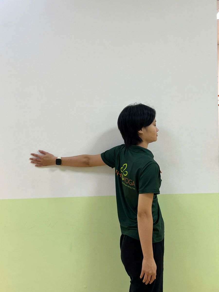 - Cách thực hiện: Đứng nghiêng cạnh tường, đặt lòng bàn tay và cẳng tay lên tường, nhẹ nhàng xoay người ra ngoài cho đến khi cảm thấy căng nhẹ ở ngực và vai. Giữ 20–30 giây.