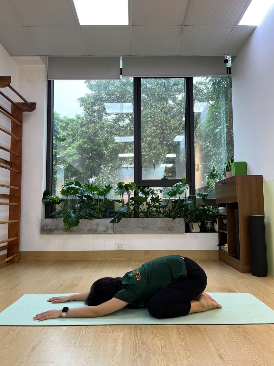 - Cách thực hiện: Quỳ gối, duỗi tay về phía trước, hạ trán xuống sàn. Có thể đan tay và đưa ra sau lưng để tăng độ giãn vùng vai.