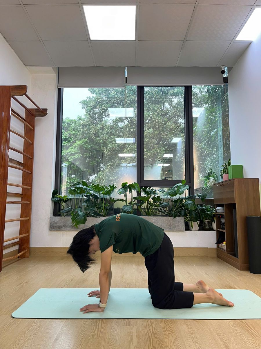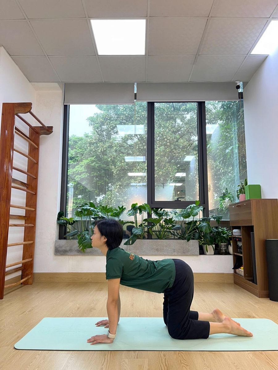 - Cách thực hiện: Ở tư thế bò (tay và gối chạm sàn), hít võng nhẹ lưng xuống, nâng đầu (Con bò); thở ra, cong lưng lên, cúi đầu xuống (Con mèo).